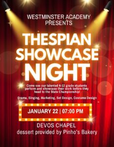 Join us for the third annual Westminster Academy Thespian Showcase Night at 7:00 p.m. in the DeVos Chapel!